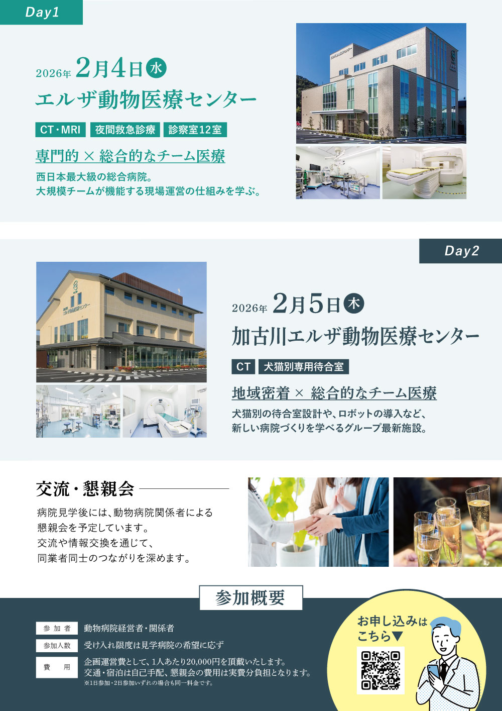 犬猫別の待合室設計や、ロボットの導入など、新しい病院づくりを学べるグループ最新施設。